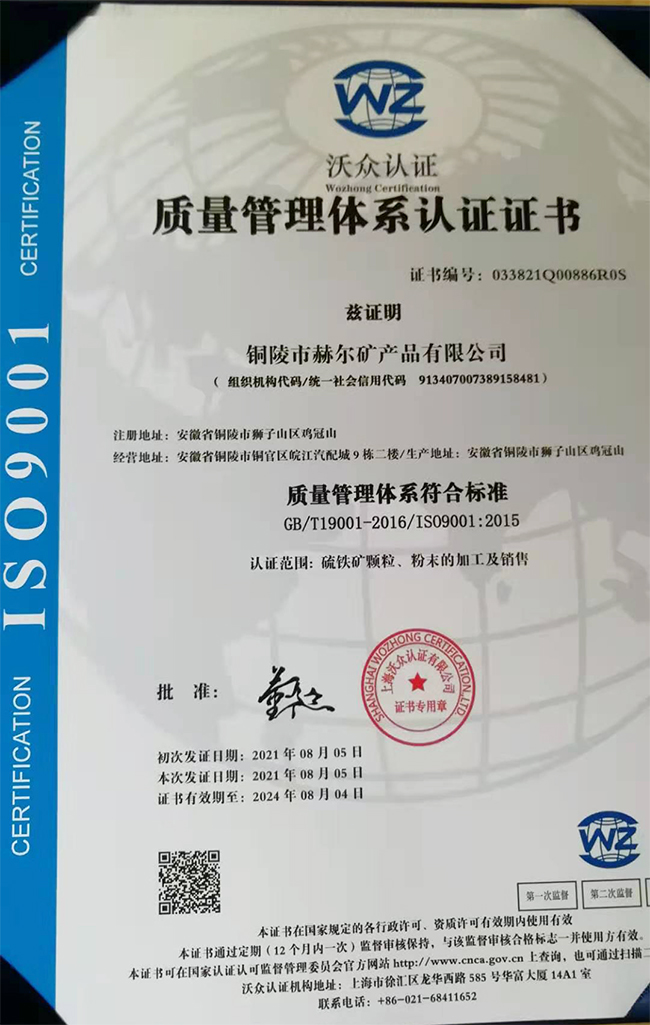 銅陵赫爾礦產(chǎn)品獲質(zhì)量管理體系認(rèn)證證書